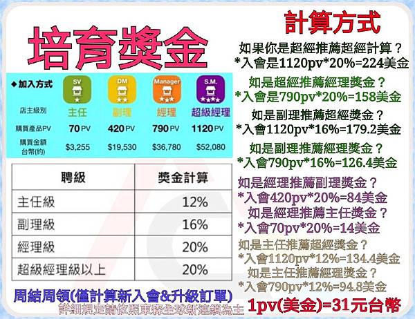 領獎金條件:只需直推一人即可開始領取,,當月須完成40PV責任額。